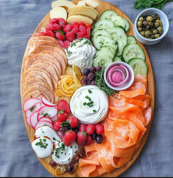 Indulge in The Luxe Lox Board – a seafood lover's paradise that's perfect for any occasion! 🌊✨ This irresistible spread features premium smoked salmon, succulent shrimp, velvety cream cheese, briny capers, and a selection of artisan-cut cheeses, all thoughtfully curated for an unforgettable taste experience. Whether you're hosting brunch or looking to impress at your next event, this board delivers pure luxury in every bite. Elevate your gathering with flavors that are as beautiful as they are delicious – treat yourself and your guests to the ultimate gourmet indulgence!
